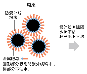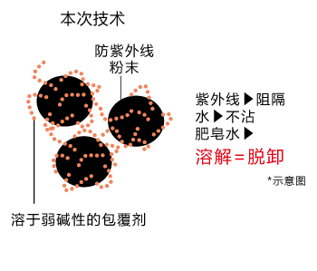 防水防晒霜当然必须防水。开发本技术之前,防紫外线粉末都是用不溶于水的物质包覆。但是,这样会导致难以脱卸,需要使用专用的清洁剂。