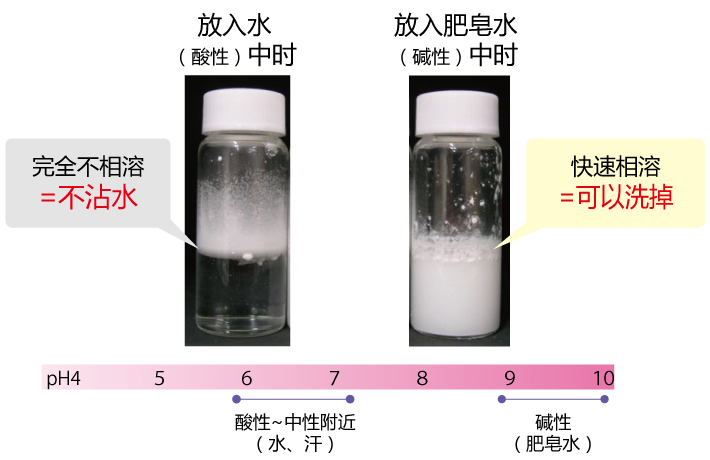 pH是指氢离子浓度的指数,pH低时呈酸性,高时呈碱性,中间呈中性。水和汗呈酸性~中性,肥皂水呈弱碱性。我们以此为着眼点,开发了溶于酸性和中性物质但不溶于碱性物质的特殊粉末。