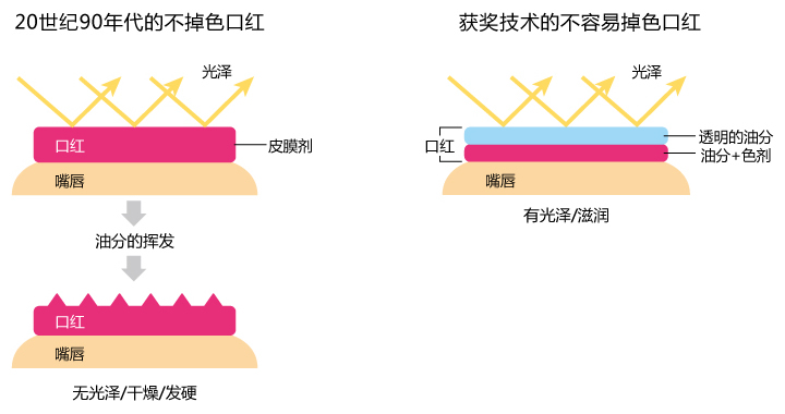 1990年代曾掀起一股“不掉色口红”热,但因为当时采用的是涂在嘴唇上,一旦油分蒸发就会一下子凝固的“皮膜剂”,所以存在干燥、表面凹凸不平或失去“光泽”等难点。