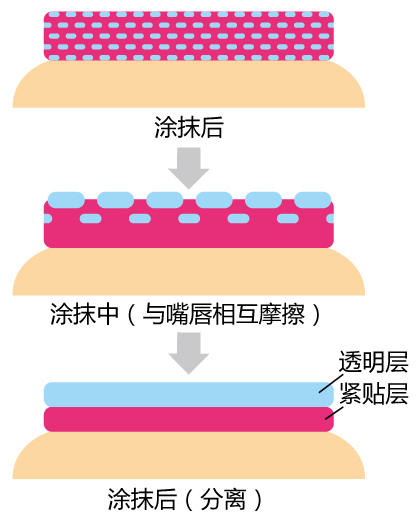 接下来考虑的是只要一涂上就会慢慢渗出透明油分,变成2层的功能。这样一来,印在杯子上的就只是透明的油分,不会留下颜色。实际上,以前我们也曾推出过一种“2次涂抹类型”商品,即在带颜色的口红上再涂上一层像亮油一样的透明物质。但是,必须等到第一次涂抹的口红干了后才能在其上面涂抹,因此很多人都抱怨“太麻烦”,于是我们开始考虑如何在1支唇膏中实现“不掉色”。