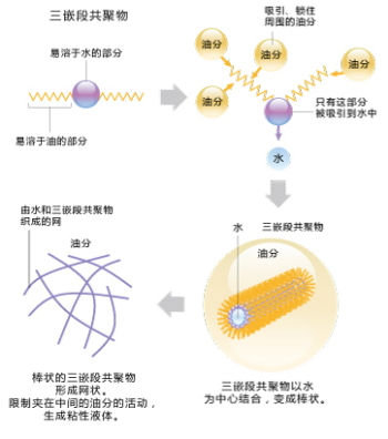 这样一来,中央“易溶于水”的部分就会被吸引到少量的水中,使一个个聚合物相互结合,已结合的聚合物之间相互交织后,会形成一张网眼状的网。通过这个网限制油的活动,让原本稀薄的油变成粘稠状,这就是原理。