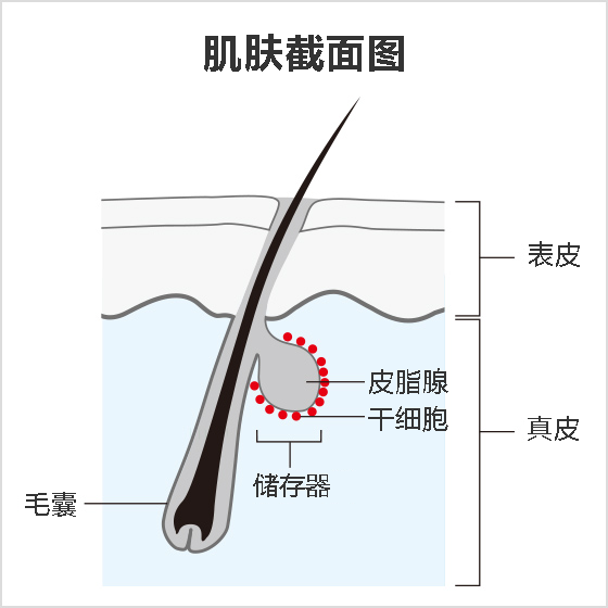 继续对肌肤进行观察后得知,老年人肌肤的皮脂腺周围仍处于良好的状态。皮脂腺位于肌肤各处,为肌肤补充油脂。通过对皮脂腺周围细胞的观察,发现了大量能够创造全新细胞的“干细胞”,这里即为干细胞的储存器。